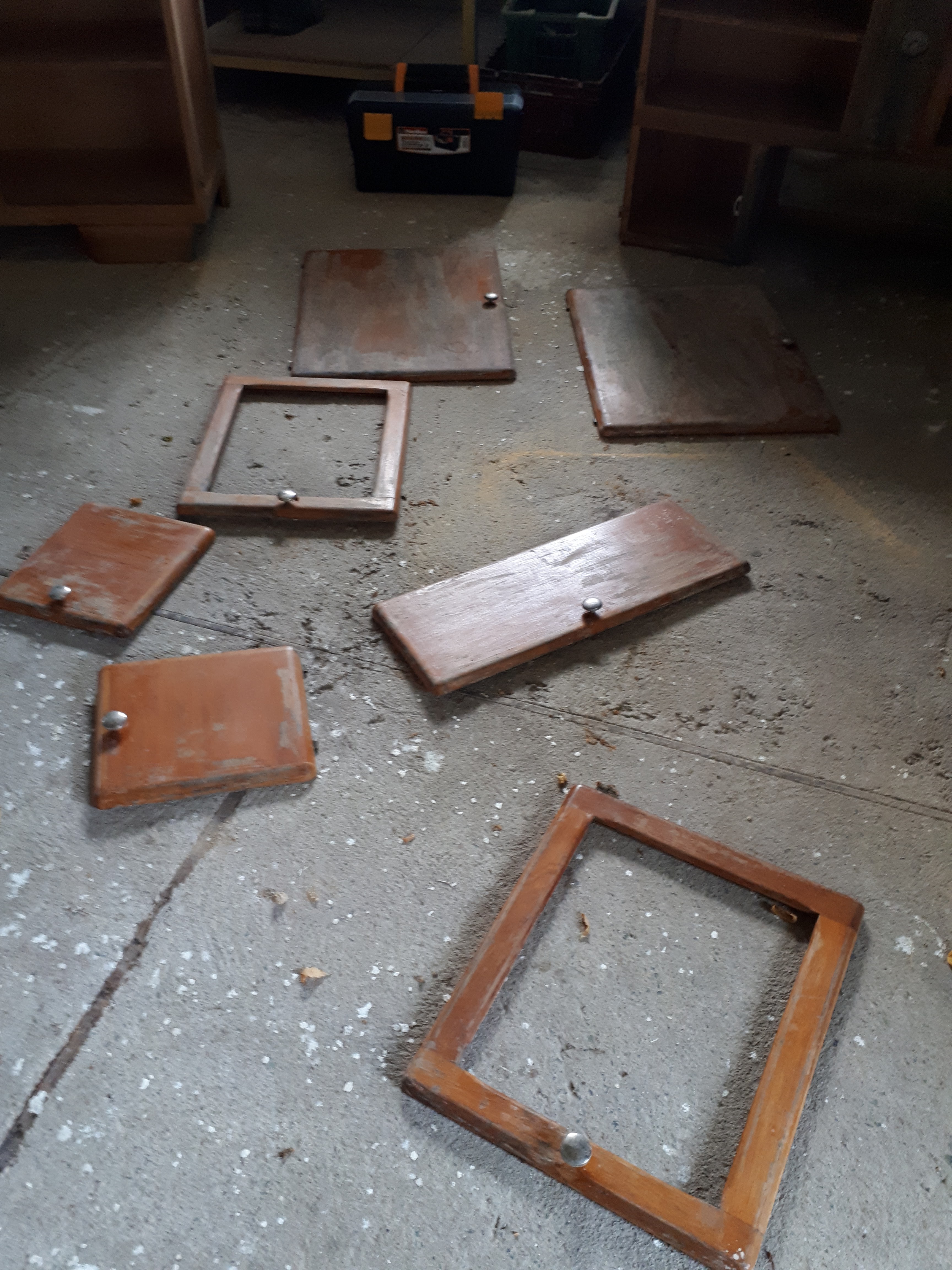 En allant chercher le buffet, je m’aperçois que la vitre gauche est fêlée ce qui réduit à néant tout espoir de conservation. Comme pour m'aider dans ce travail de deuil, un dos d'âne plus tard et je perds une porte du buffet le long de la route (j'ai pu la récupérer) et la vitre explose littéralement dans la remorque. Plus besoin de se poser mille question de restauration, je décide de retirer les 2 vitres.